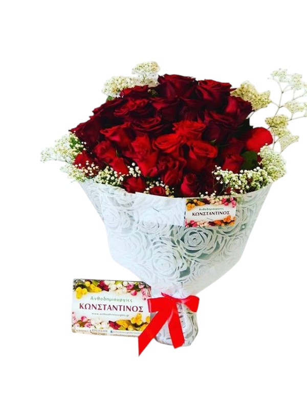 Luxurious bouquet with 34 Dutch red roses combined with greenery and gypsum. Same day Delivery of flowers in Thessaloniki. We serve east, west and center.