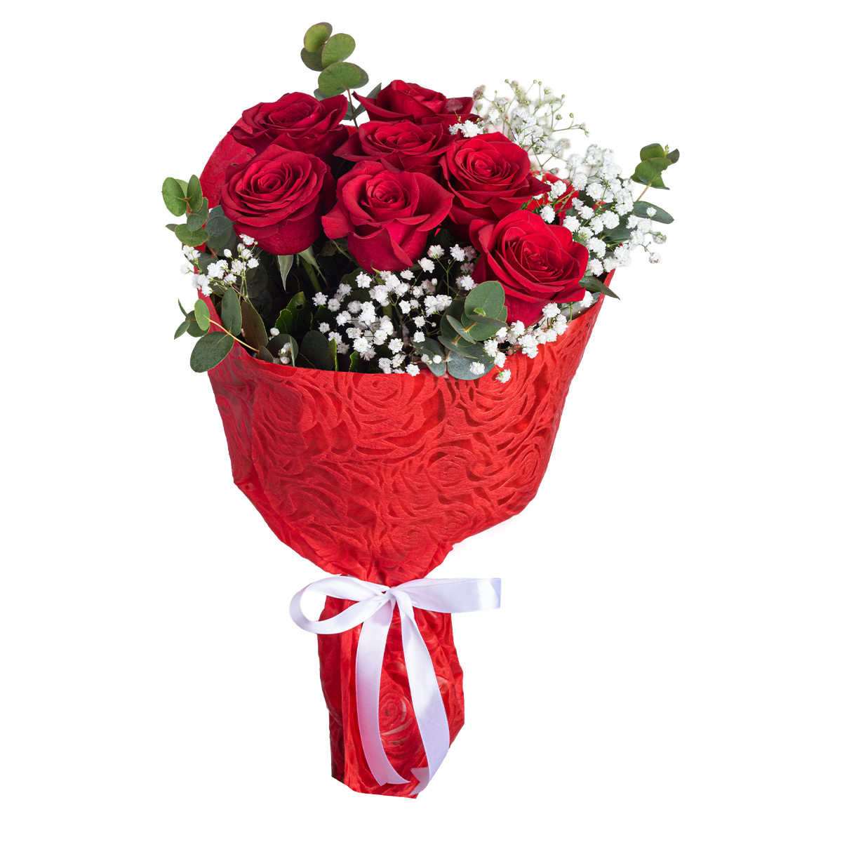 Bouquet of 7 brilliant red luxury roses imported from Ecuador.