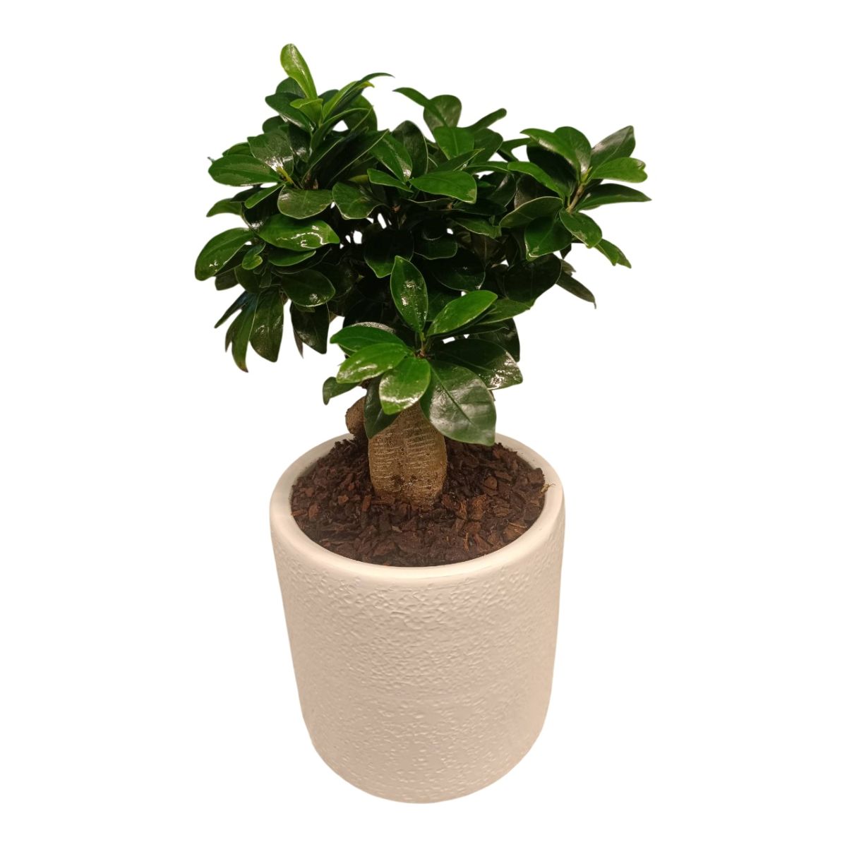 Bonsai plant 50 cm high in a special ceramic case of white or gold color depending on availability. You can buy it online at an offer price.