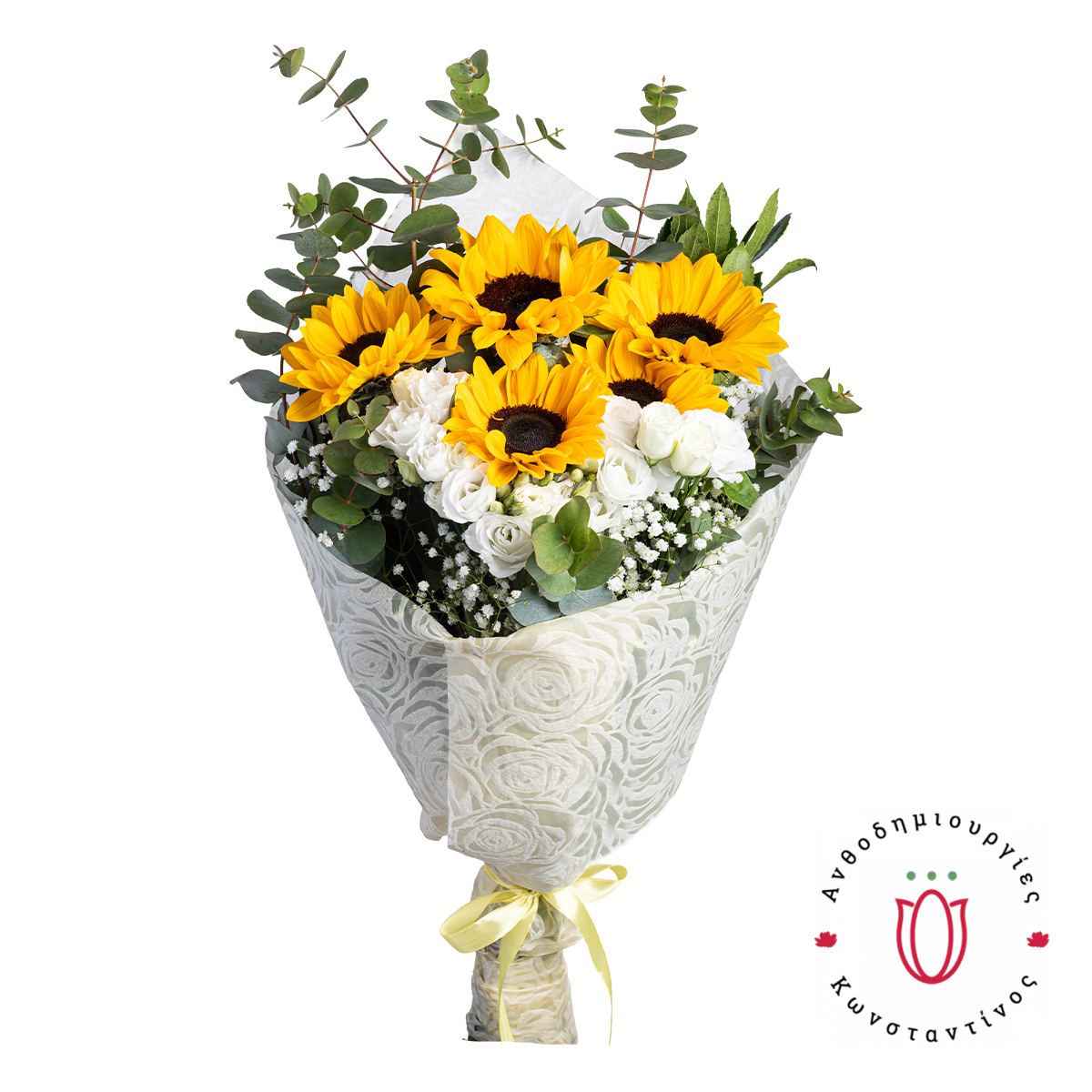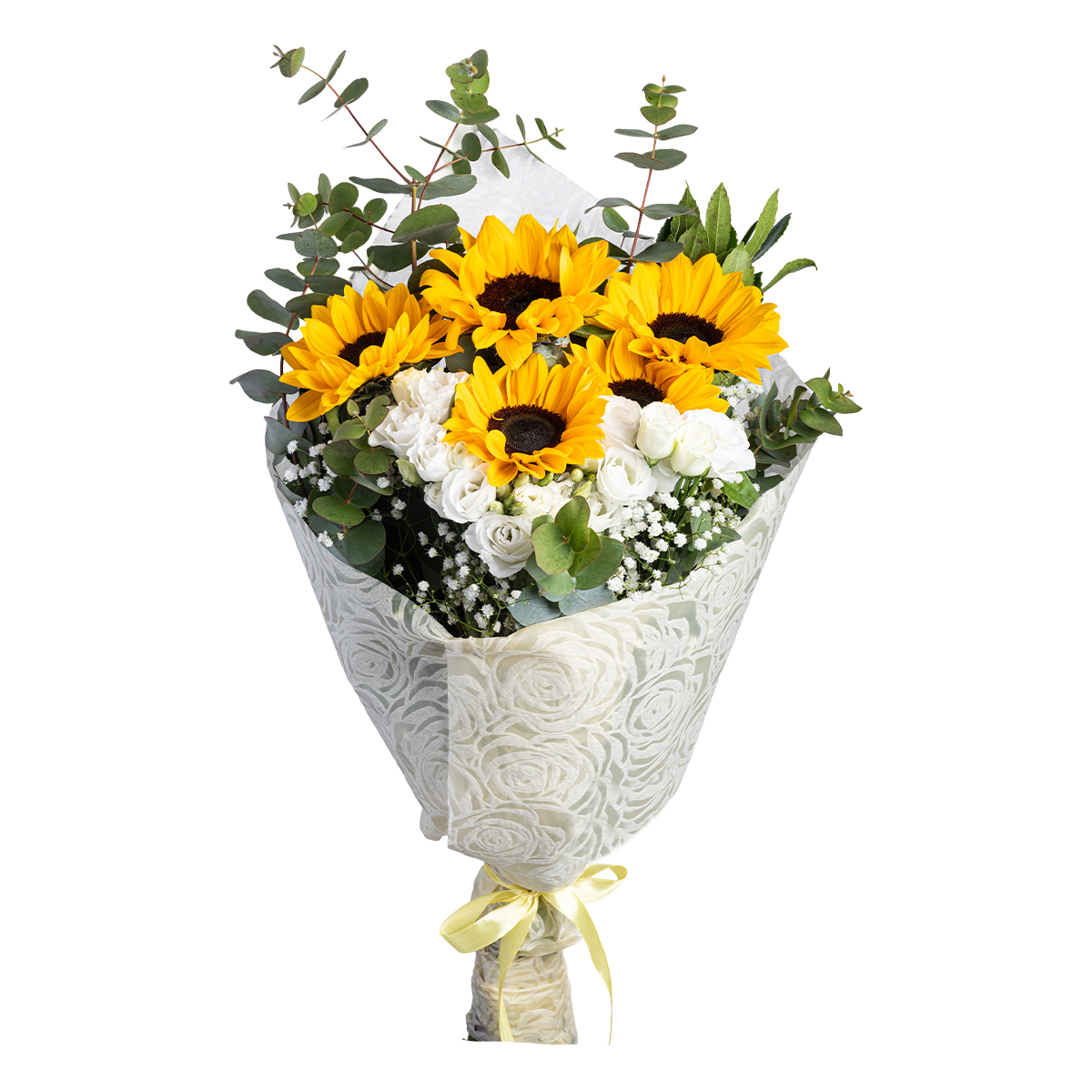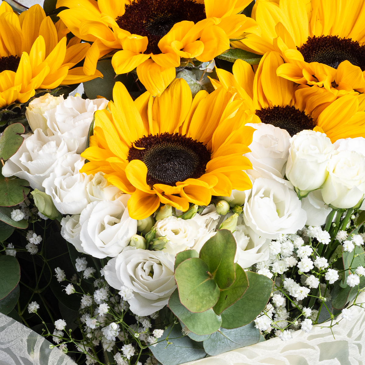Original bouquet of sunflowers, lysianths and solitango in shades of white yellow.
