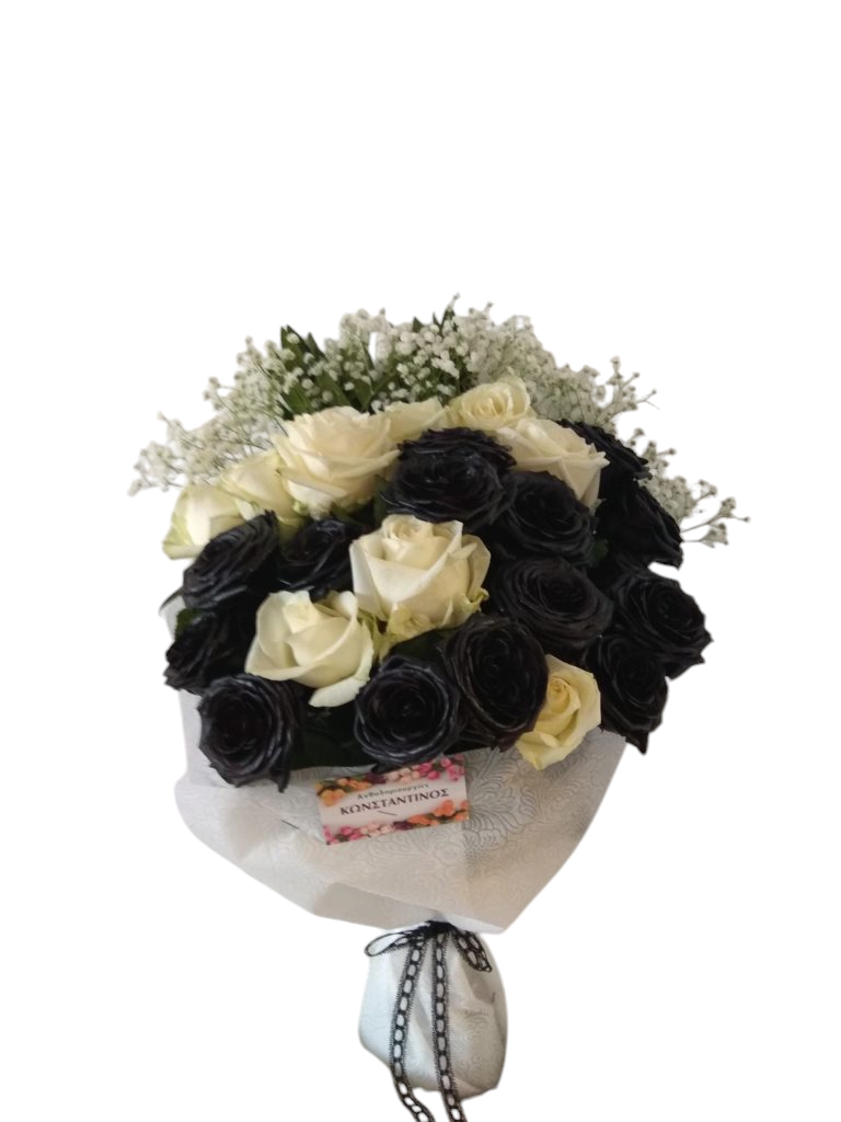 Bouquet with white and black roses accompanied by white gypsophyll flowers decorated with white fabric and black lace. Free shipping for the city of Thessaloniki.