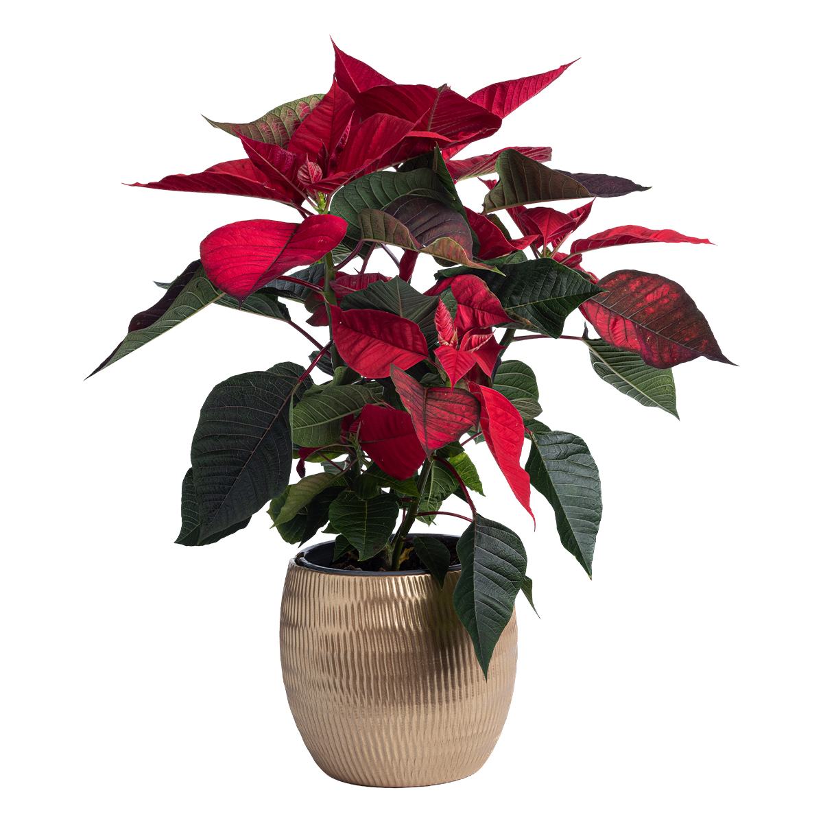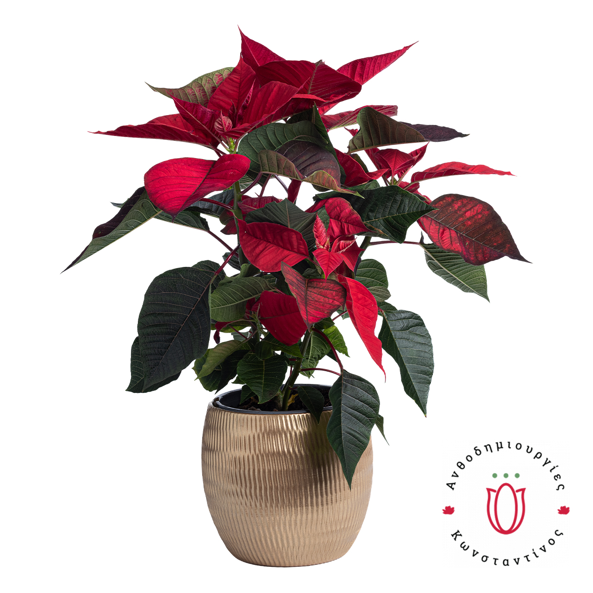Ένα εντυπωσιακό αλεξανδρινό ύψους 45cm  περίπου τοποθετημένο σε κομψό χρυσό κεραμικό κασπώ, ιδανικό για να προσθέσει λάμψη και γιορτινή ατμόσφαιρα σε κάθε χώρο. Το πλούσιο κόκκινο χρώμα του φυτού σε συνδυασμό με το πολυτελές χρυσό δοχείο δημιουργεί ένα αρμονικό και elegant αποτέλεσμα που ξεχωρίζει.