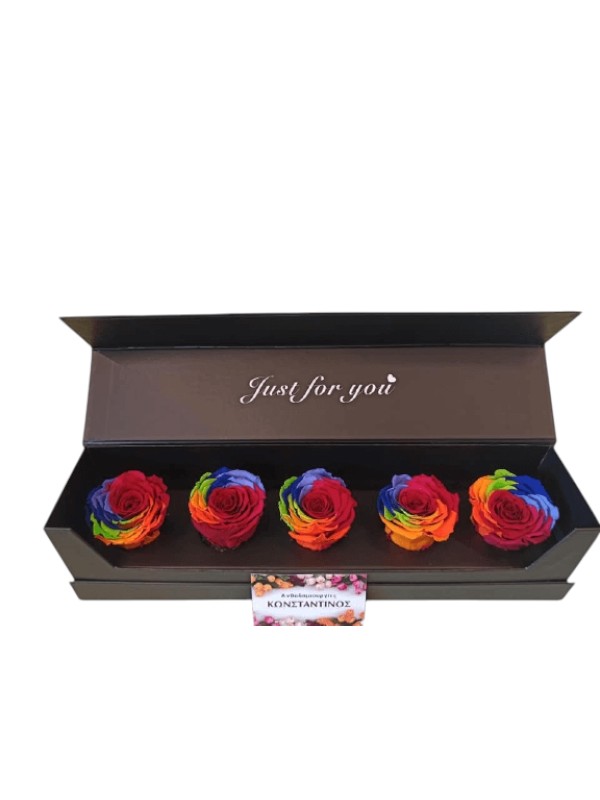 Μια υπέροχη δημιουργία από 5 forever rose RAINBOW  σε ιδιαίτερο κουτί δώρου. Αποστολη σε όλη την Ελλάδα. Δωρεάν μεταφορικά.