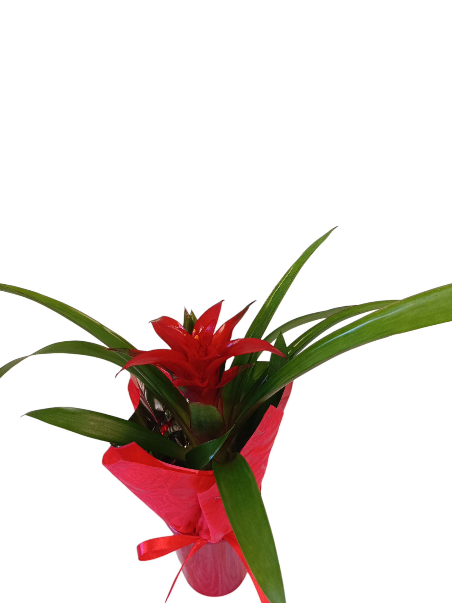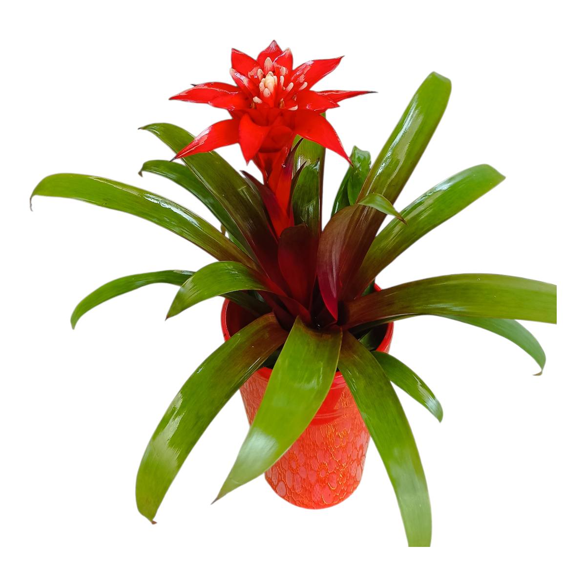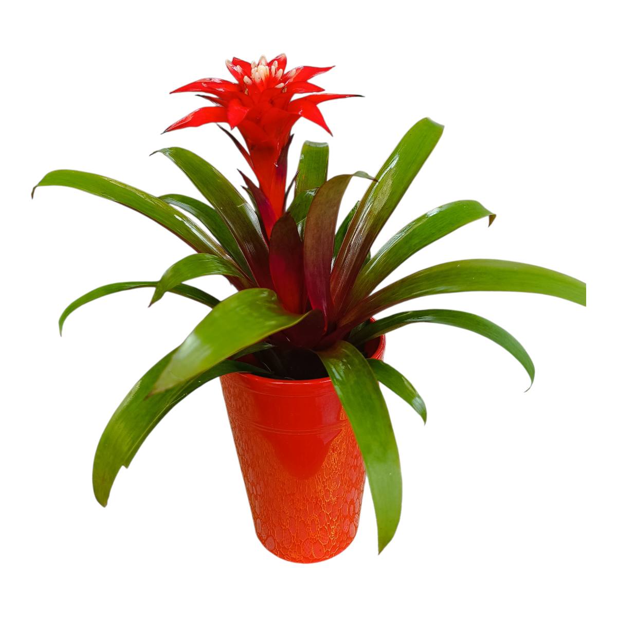 Εντυπωσιακή κατακόκκινη Γκουσμανια σε ωραίο κεραμικό . Ύψος προϊόντος 30 με 35 cm.
