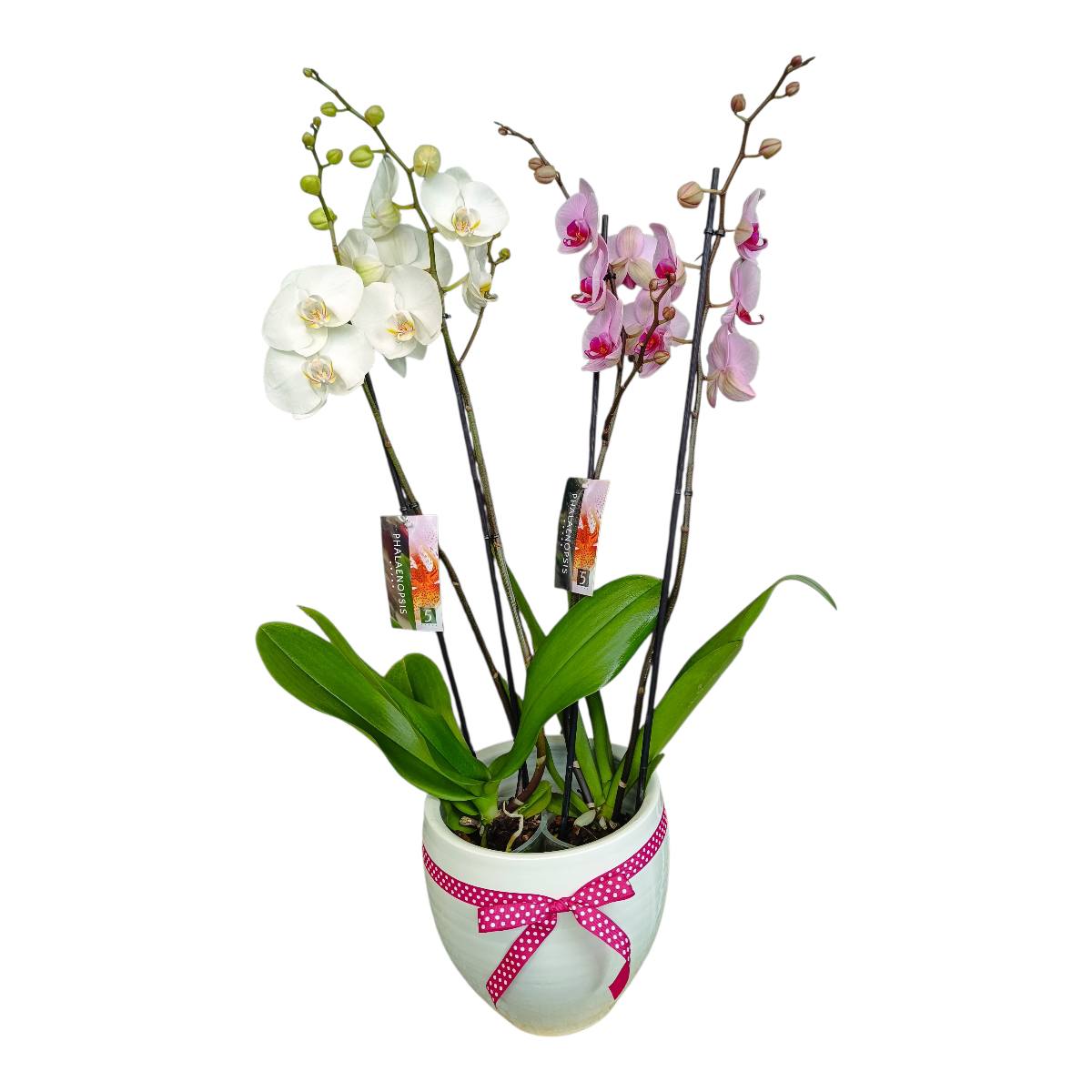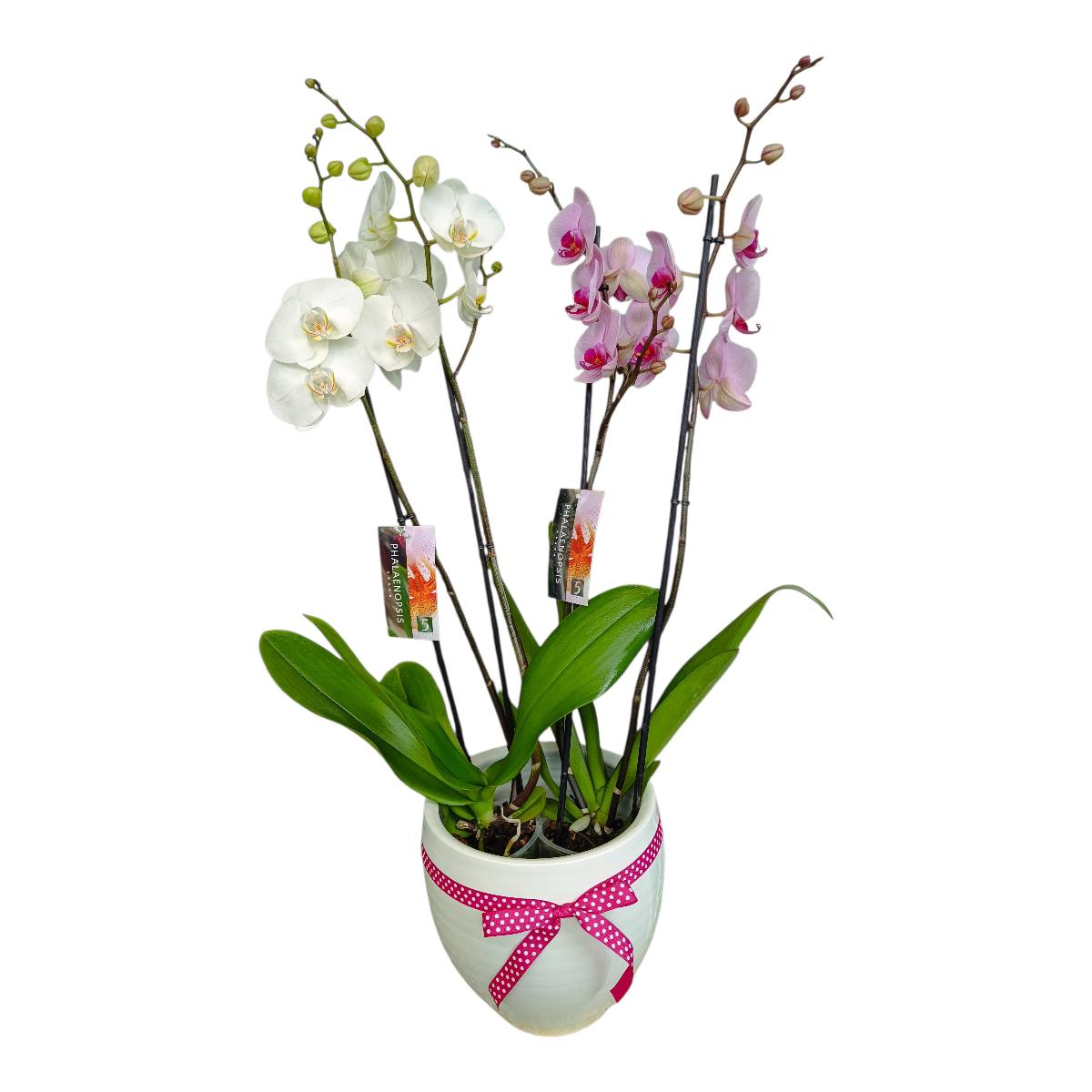 Μια κομψή και διαχρονική σύνθεση με τετράκλωνες ορχιδέες σε κεραμικό δοχείο, σε απαλές αποχρώσεις λευκού και ρόζ, ιδανική για να καλωσορίσετε ένα νεογέννητο κοριτσάκι.
