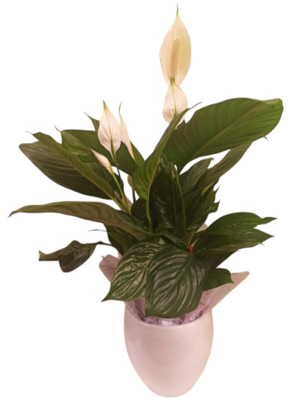 Σπαθίφυλλο σε διακοσμητική γλάστρα χρώματος λευκό ή  γκρι . Η επιλογή γίνεται  ανάλογα με την διαθεσιμότητα.