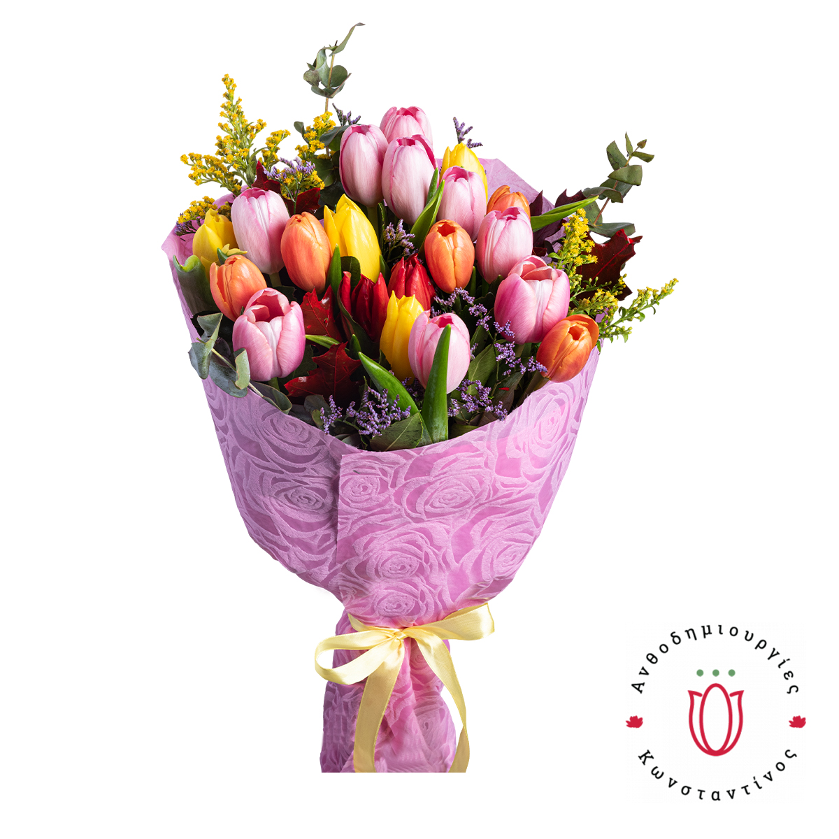 Μπουκέτο με 20 πανέμορφες πολύχρωμες  τουλίπες,  φυλλώματα πρασινάδας και γυψοφύλλη.